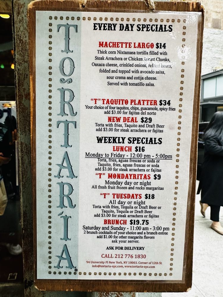 Introducing Tortaria, a Mexican restaurant located in New York City's bustling Union Square area. With a wide range of menu options, Tortaria offers authentic Mexican flavors with a twist. From their Al Pastor Taquitos to their Braised Short Rib Torta, each dish is packed with bold and savory flavors that will leave your taste buds craving for more. The vibrant and casual ambiance of the restaurant makes it a perfect spot for a quick lunch or a lively dinner with friends and family. Don't miss out on their unique dish, "The Machete," meant for sharing and guaranteed to impress. With great customer service and a welcoming atmosphere, Tortaria is a must-visit for anyone looking to experience delicious Mexican cuisine in the heart of the city.